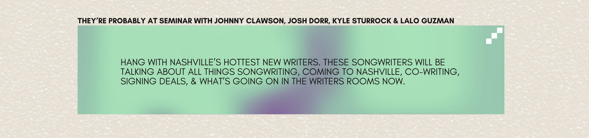Seminar attendees who register (and at least partially paid) by March 2nd have the opportunity to submit one original song for the chance to play in a Tin Pan South "Best Of" Songwriting Seminar round. On March 2nd, 2026, the song submission opportunity closes, and all submitted songs go through a first round of judging by the NSAI Creative Team. This process narrows eligible submissions to a “Top 24”. On March 6th, 2026, voting opens to choose the "Top 12 Best Of Seminar" songs. ONLY 2026 SEMINAR ATTENDEES ARE ELIGIBLE TO VOTE. Sending the voting link to non-attendees could disqualify your entry. The writers of the Top 12 songs will have the opportunity to play their song during the Tin Pan South Songwriters Festival on Saturday, March 28th! Please address all questions to [email protected] See below for more details. *Dates subject to change.